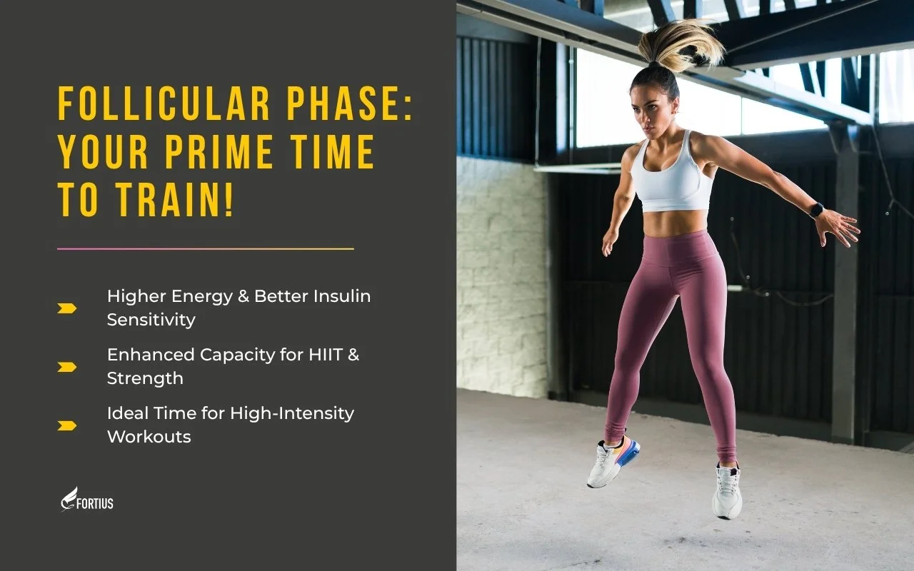 - The Follicular Phase (First ~14 days): This menstrual phase starts on the first day of your period when your period starts. During these follicular phase days, your follicle-stimulating hormone (FSH) signals the ovaries to prepare an egg. As the dominant follicle grows, estrogen rises, peaking around the ovulation phase. - Your Body's State: You generally have more energy, better insulin sensitivity (meaning your body handles complex carbs more efficiently), and a greater capacity for high-intensity interval training (HIIT) and acute strength performance.