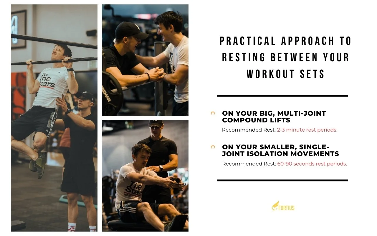 On your big, multi-joint compound lifts, take the longer 2-3 minute rest periods. This is where you are lifting the heaviest and need the most recovery.